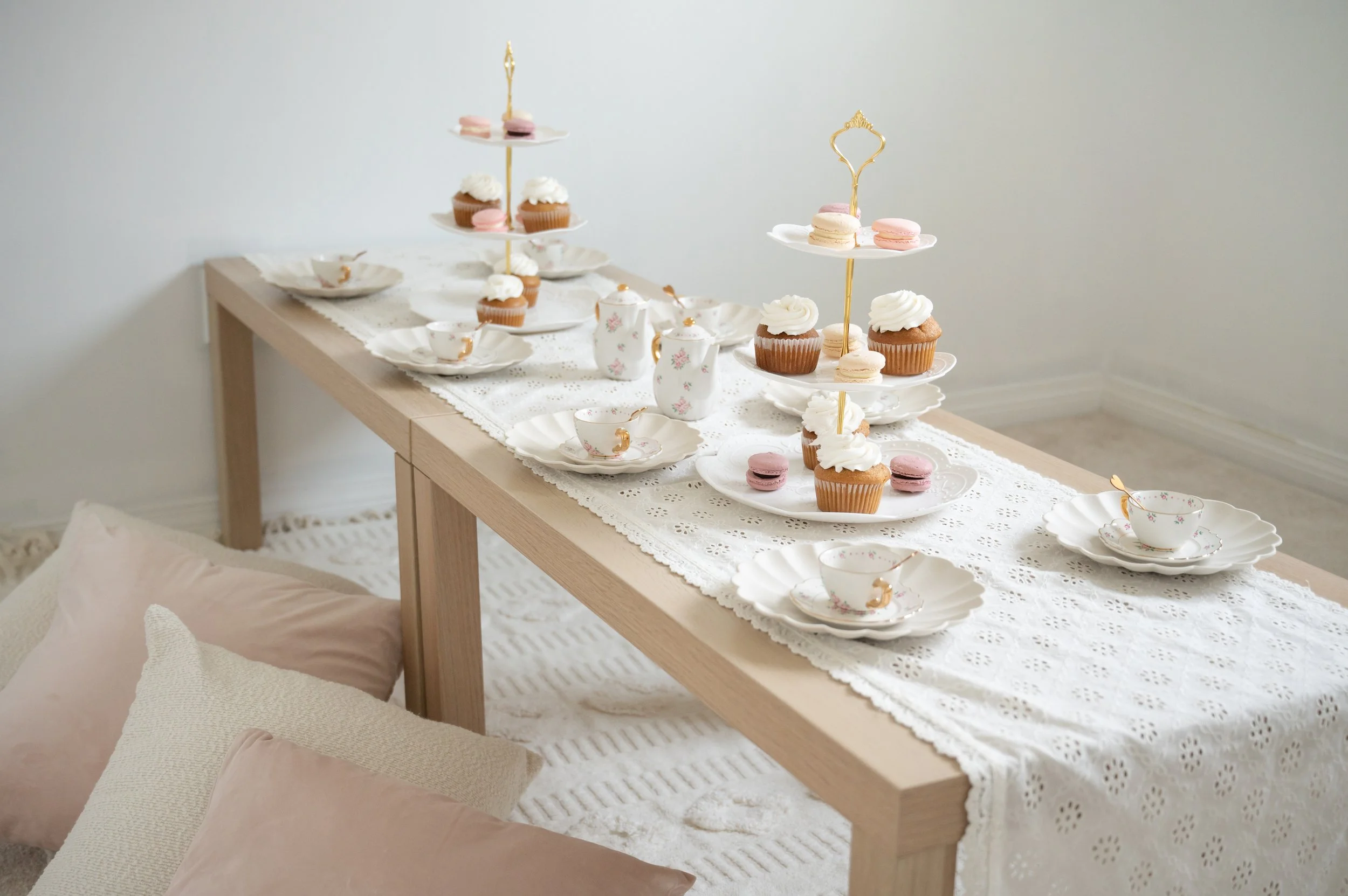 • A table set for tea with teacups, saucers, teapots, cupcakes, and macarons, decorated with a white lace tablecloth and surrounded by pink cushions on the floor.