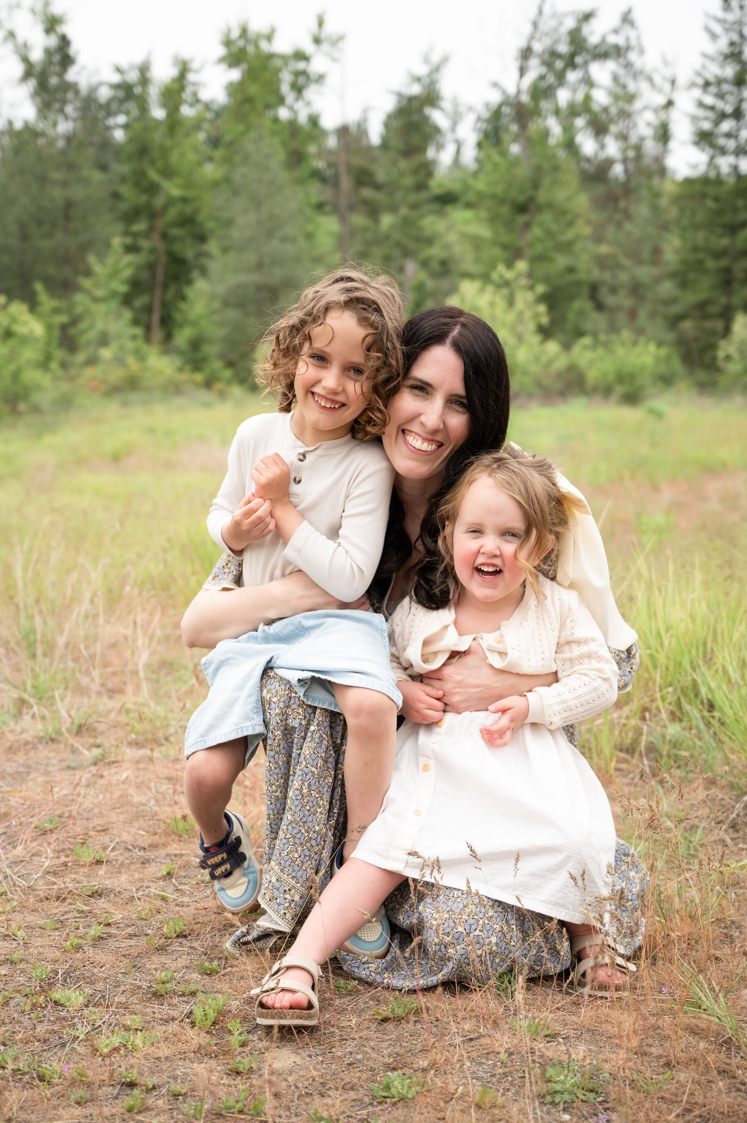 A woman and two young children smiling and hugging outdoors in a grassy field with trees in the background.
