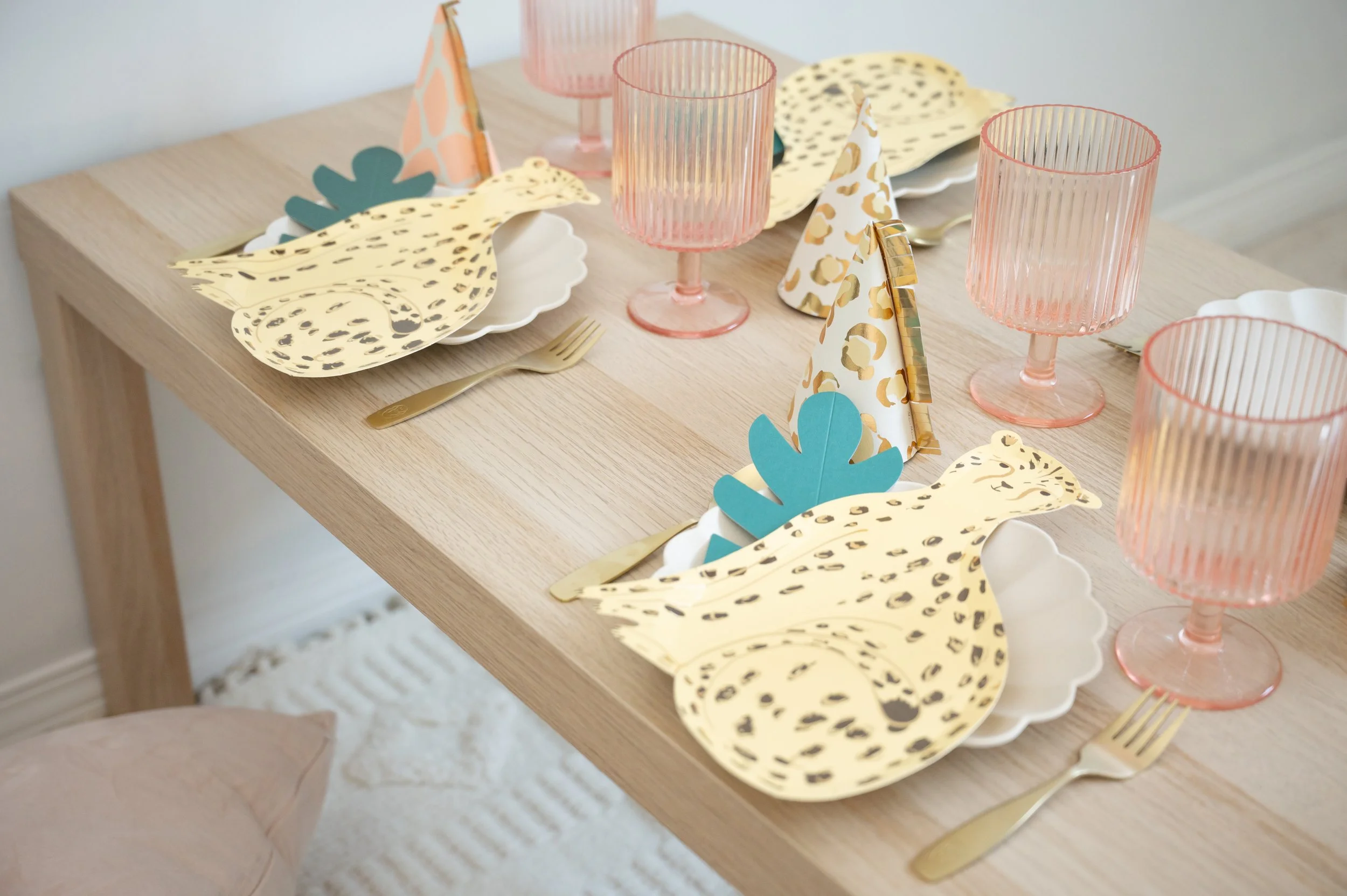 • Party table setting with cheetah-patterned paper plates, pastel pink glasses, gold utensils, and decorated paper party hats with farm animal theme.