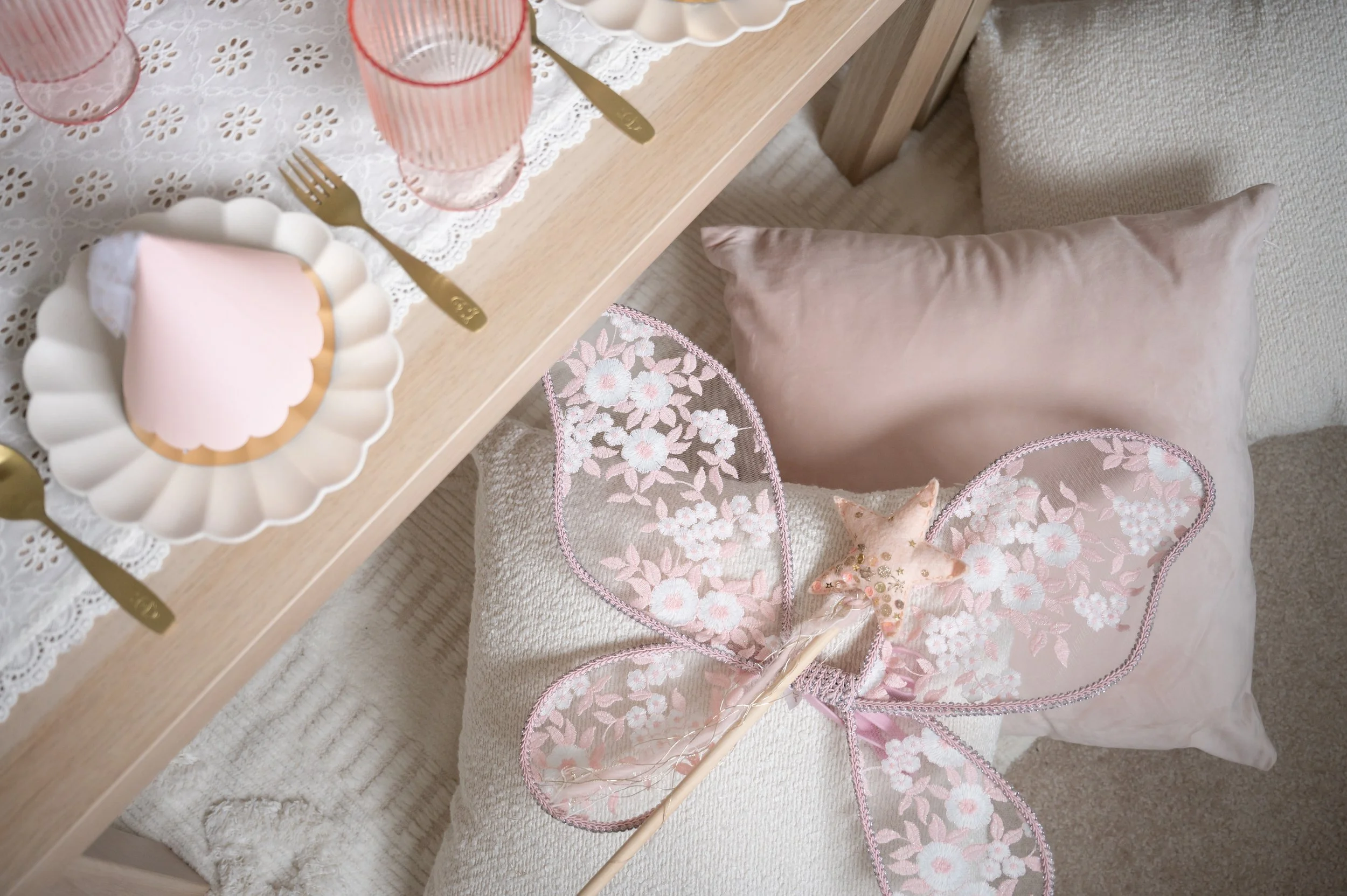 • Decorative fairy wand with pink and white floral embroidery on transparent pink wings, resting on a beige cushion on a striped beige sofa, near a pink throw pillow beside a light wooden table set with pink glassware and white plates with pink scalloped desserts.