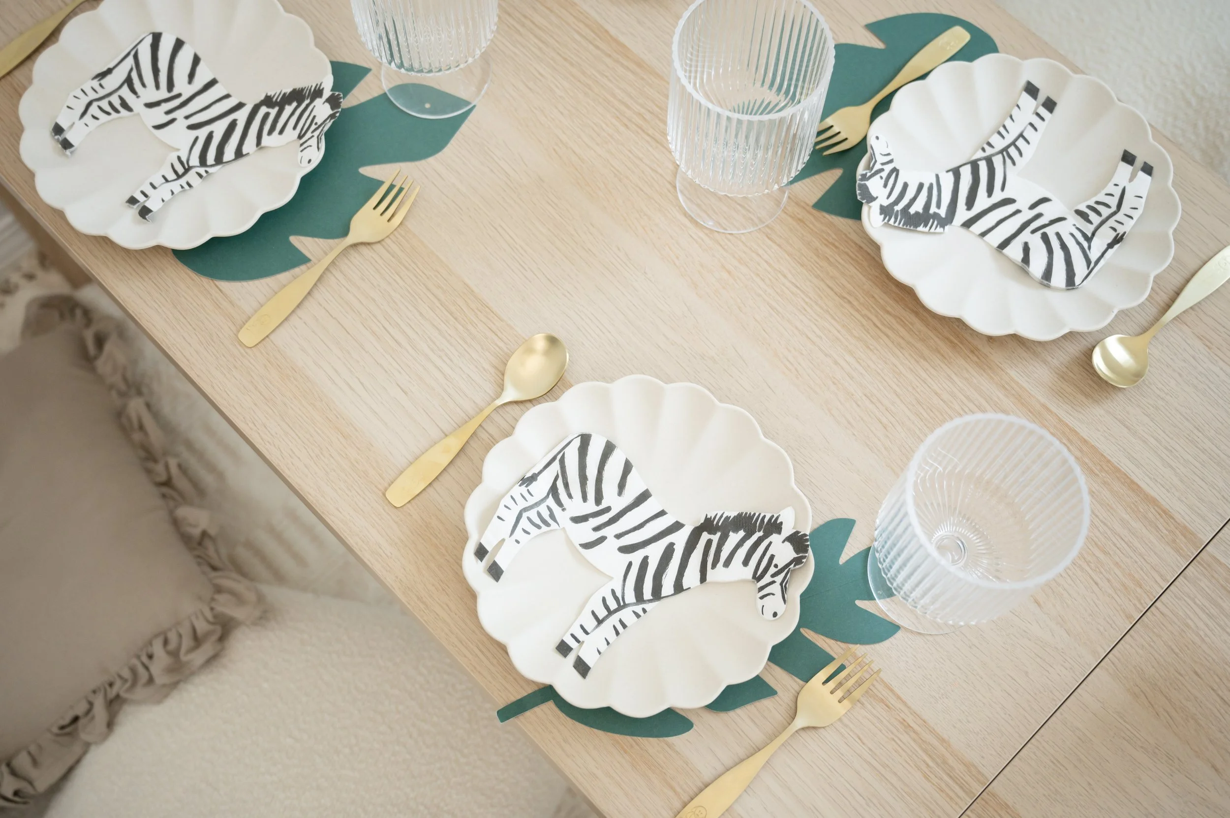 Table setting with white scalloped plates featuring zebra illustrations, gold forks and spoons, and clear textured glasses, on green leaf-shaped placemats, on a light wooden table.