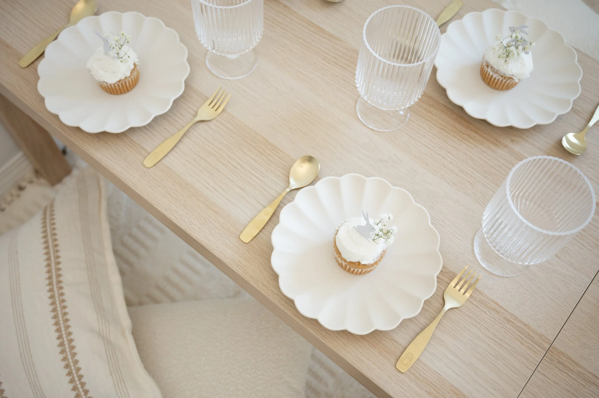 • A neatly set dining table with white plates each holding a cupcake decorated with white flowers and a bunny shaped topper, surrounded by clear textured glasses, gold-colored forks and spoons on a light-colored wood surface.